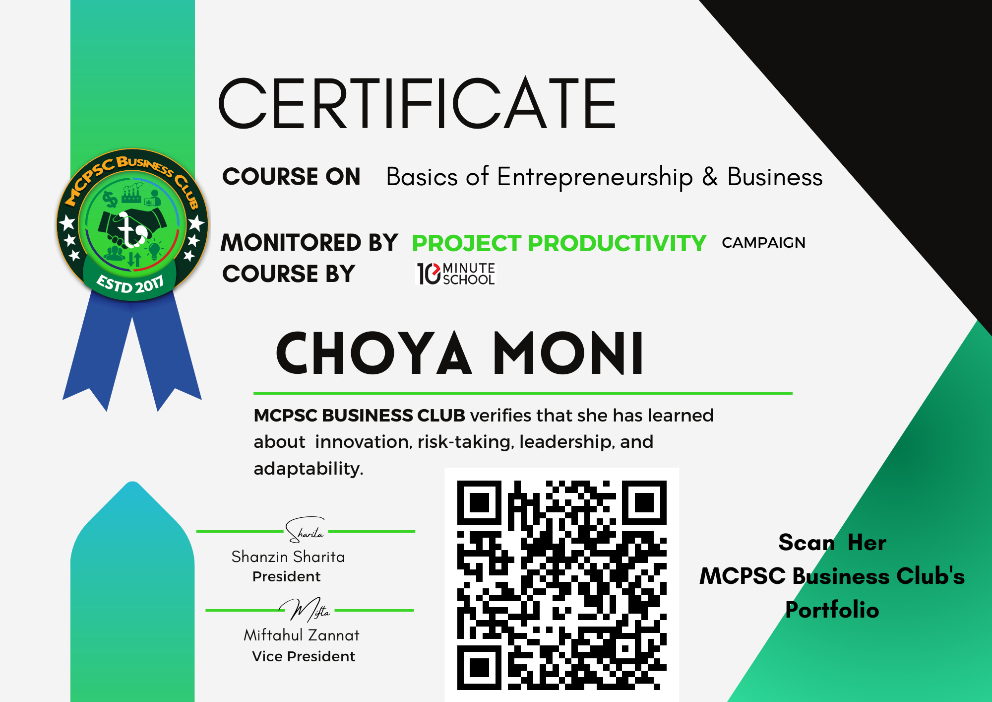 Choya Moni Greetings, view my portfolio to know about my activities, achievements And feedback from others about me.Zinnath Zafar HiyaMay 13, 2023ShareVoice & Research :"Grameenphone" joins government's (Click the button above to view research & voice)Achievements: Best Panel of The Month (January,2023)Intra 1.0 Top 3 Representative (July ,2022)Projects Organized:Green ProjectProject ProductivityAbout Project Productivityখুশি ছড়াইAbout খুশি ছড়াইCourse Completion: Basics of Entrepreneurship & BusinessThanks for reading B- AUDIO by MCPSC Business Club! Subscribe for free to receive new posts and support my work.Subscribe